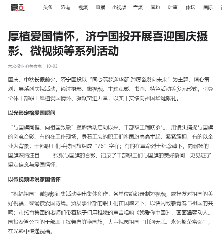 《齐鲁晚报·齐鲁壹点》| 厚植爱国情怀,乐竞平台开展喜迎国庆摄影、微视频等系列活动
